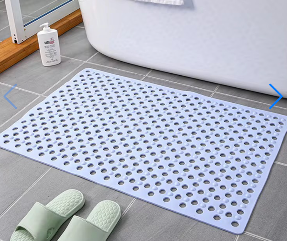 Superficie texturizada con ventosas de alta adherencia que evitan resbalones. Orificios de drenaje para secado rápido y menos moho. Material suave, resistente y fácil de limpiar; ideal para ducha o tina.